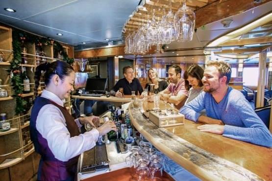 After a day of explorations passengers may relax at a Bar staffed by a professional bartender. With a wide variety of alcoholic and non-alcoholic drinks and engaging conversation, the bar on board this small luxury ship welcomes guests to mix and mingle.